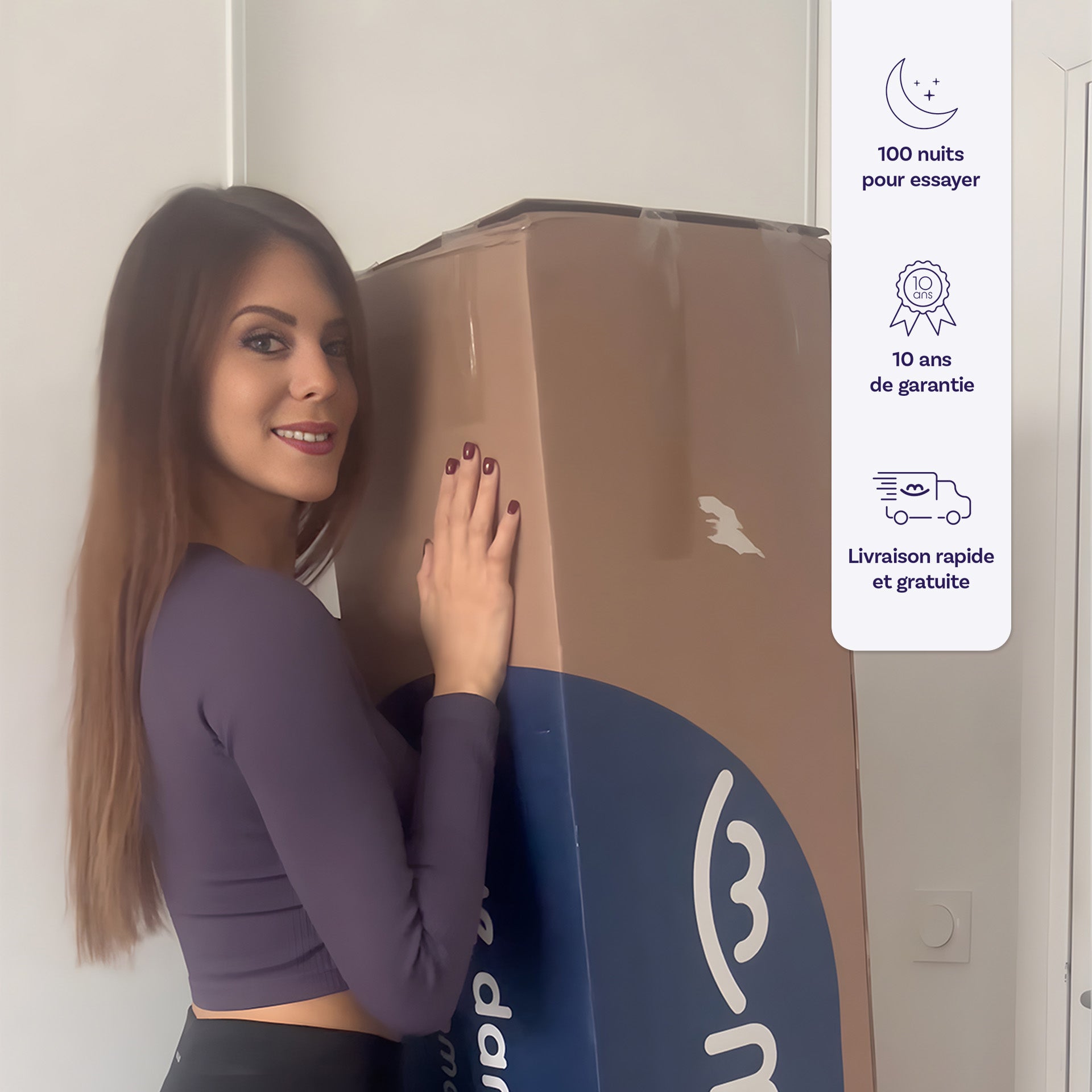 Nos matelas sont pliés, roulés, compressés et emballés dans une boîte compacte, pratique à transporter. Cette technique de « bed in box » permet une livraison facile, rapide et plus économique !
