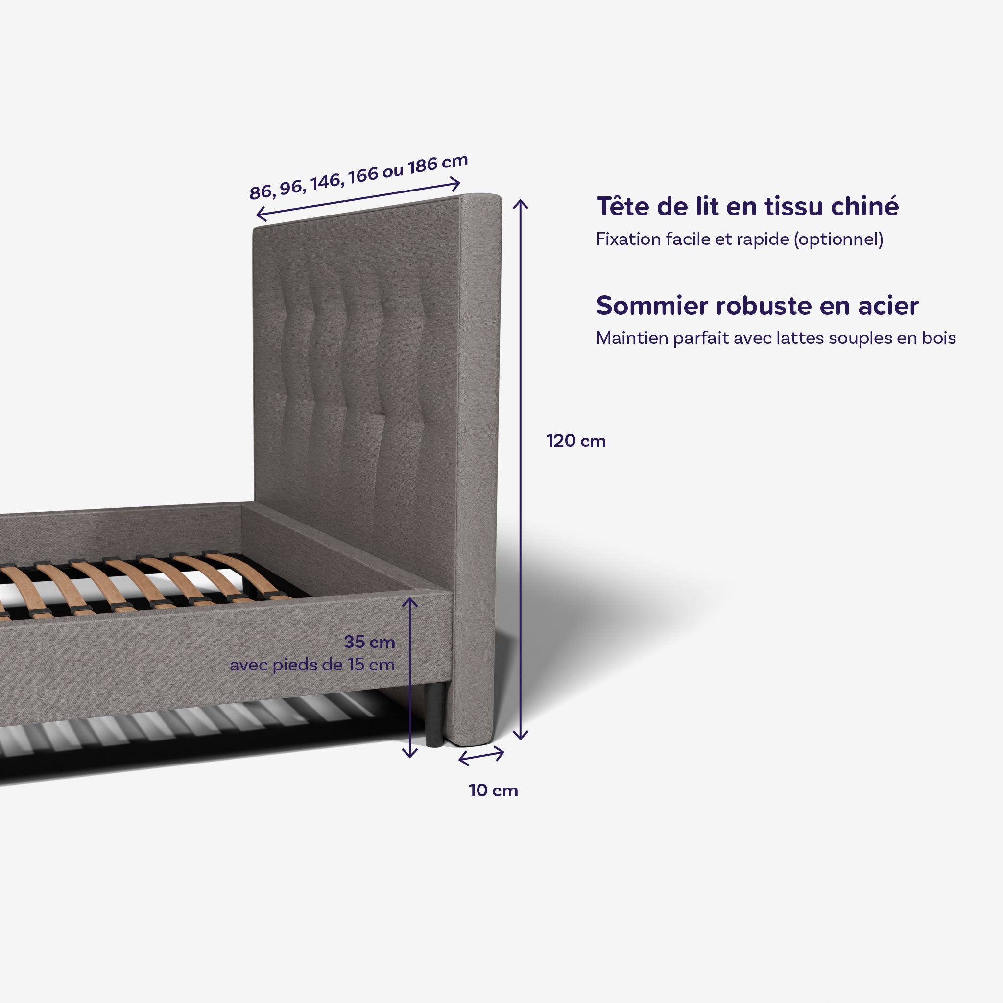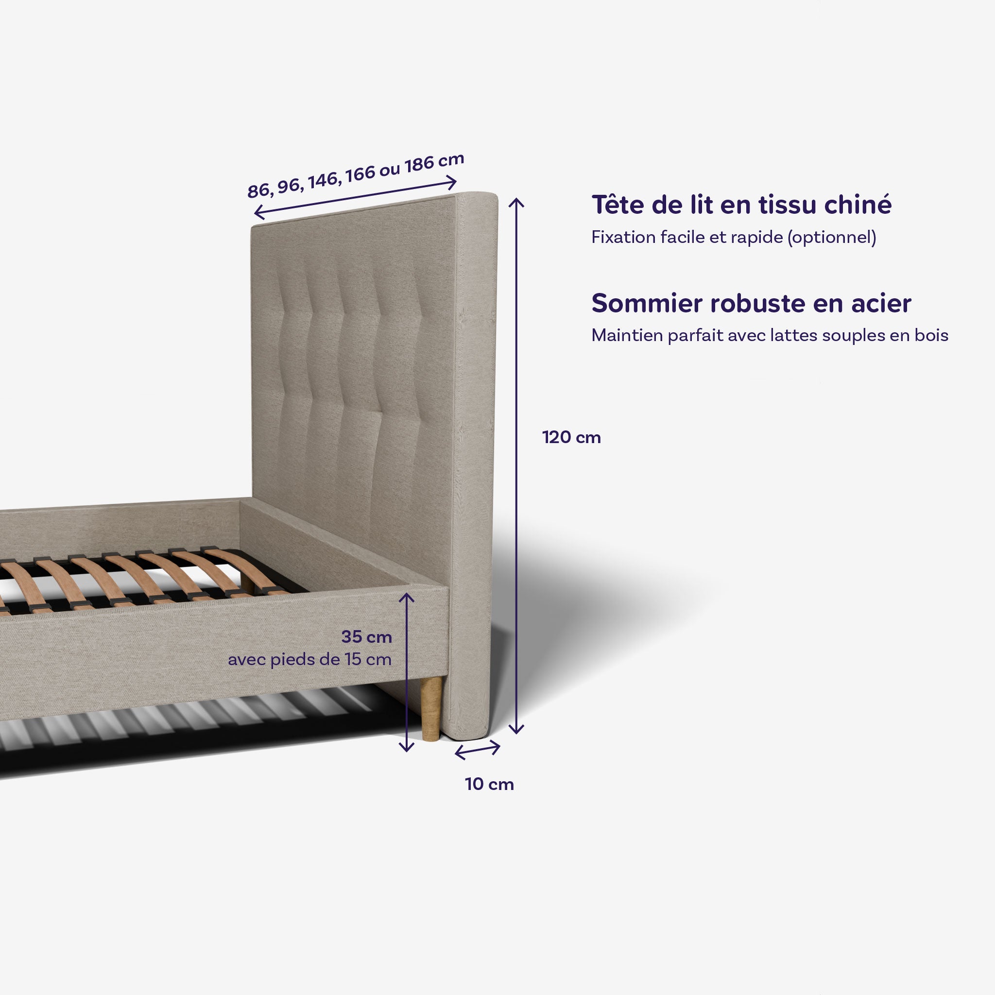 Découvrez l'alliance parfaite avec notre lit capitonné (et tête de lit) et le matelas Jade. Avec sa structure et sa tête de lit (en option) entièrement recouvertes de tissu , ce lit ajoutera une touche de glamour à votre chambre.